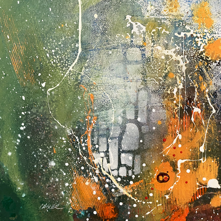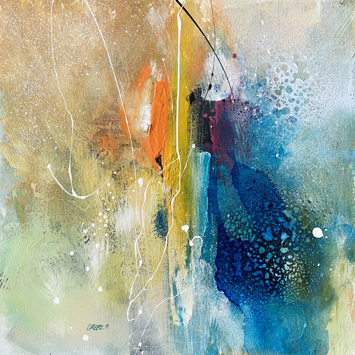 The second piece I worked on as a newly established full time painter in 2020 took some of the organic “cell” shapes from ‘Foment’ ( this term ‘cell’ was from an old friend’s comment on the work. I had no idea what he was talking about at first) and pushed it even further, perhaps too far. I’m still evaluating this even now. “Maelstrom In Blue” nudged me into seriously unknown territory, and I was incorporating stencils, dry bush techniques, wet on wet applications, warm and cool color combinations, and even new mark making ‘signatures’. I titled the painting after it was finished, and I tried to reflect some of the craziness I was trying to inject into this work into the title. I had a hard time knowing when this was finished, and even ended up sharing the piece on Facebook to try to get some of my “friends” input on it.